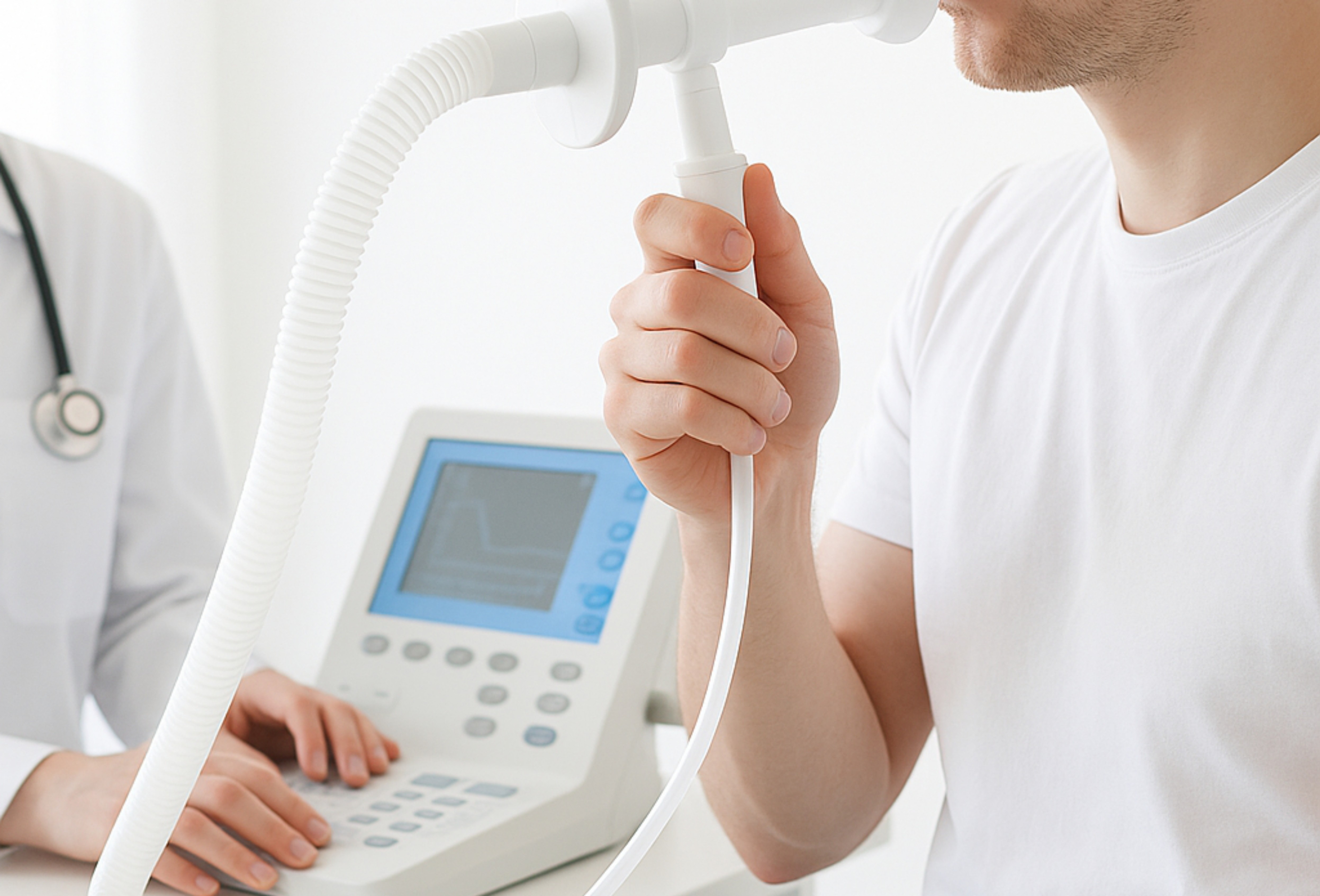 폐활량계를 가지고 환자로 하여금 숨을 들이 쉬게 하고 자신의 노력을 다해 날숨을 불어 보게 하여 이로부터 여러 측정값을 얻는 폐기능 검사를 실시 하고 있습니다.